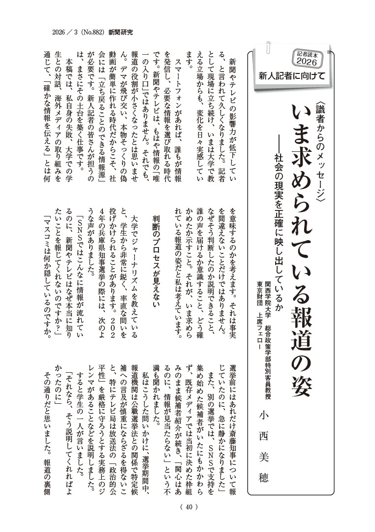 3月3日発売『新聞研究』3月号の「記者読本」に、小西美穂上席フェローの寄稿「〈識者からのメッセージ〉いま求められている報道の姿──社会の現実を正確に映し出しているか」が掲載されました。