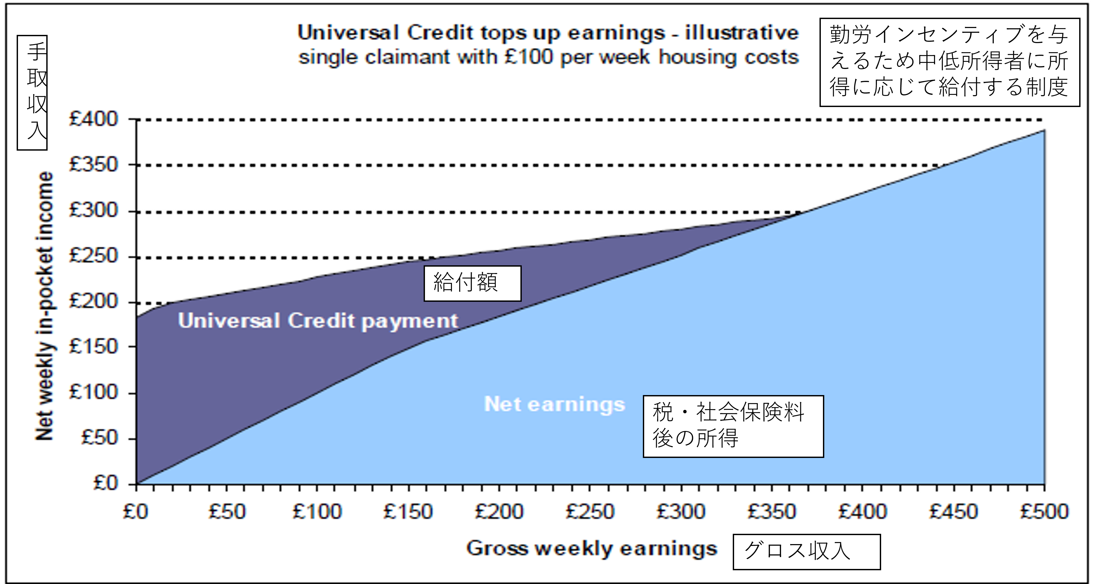 その意味で、ユニバーサル・クレジットは第1のセーフティネットとしての社会保険(雇用保険等)と、第3のセーフティネットとしての生活保護との中間の、第2のセーフティネットと位置付けられる。