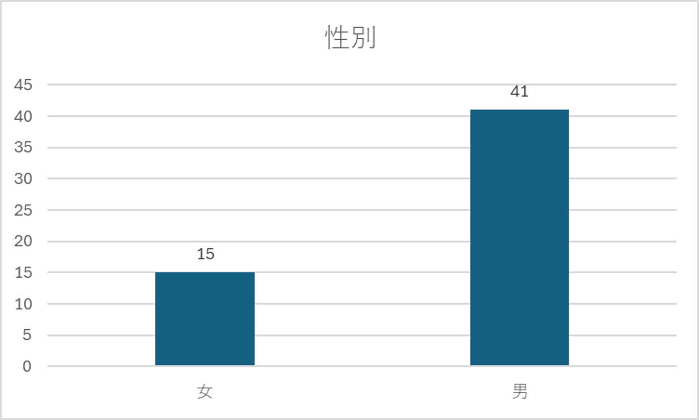 ・申請書類に性別記入欄はないため、あくまで氏名などからの推測となりますが、男性41名に対して女性が15名と男女比は約8:3となりました。