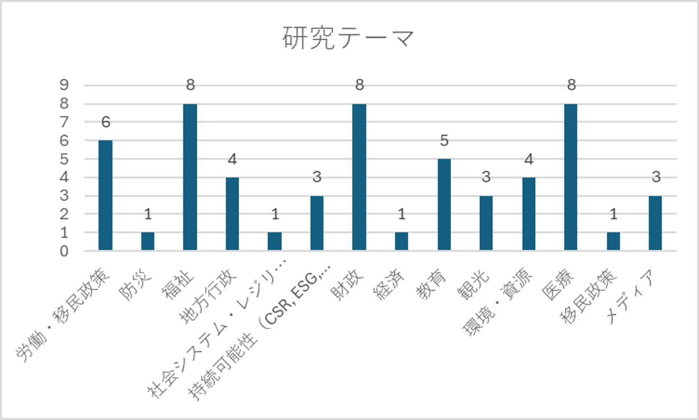 ・幅広い研究テーマでの申請がありましたが、主だったテーマとしては財政、医療、福祉、次いで労働・移民政策、教育が多くなりました。