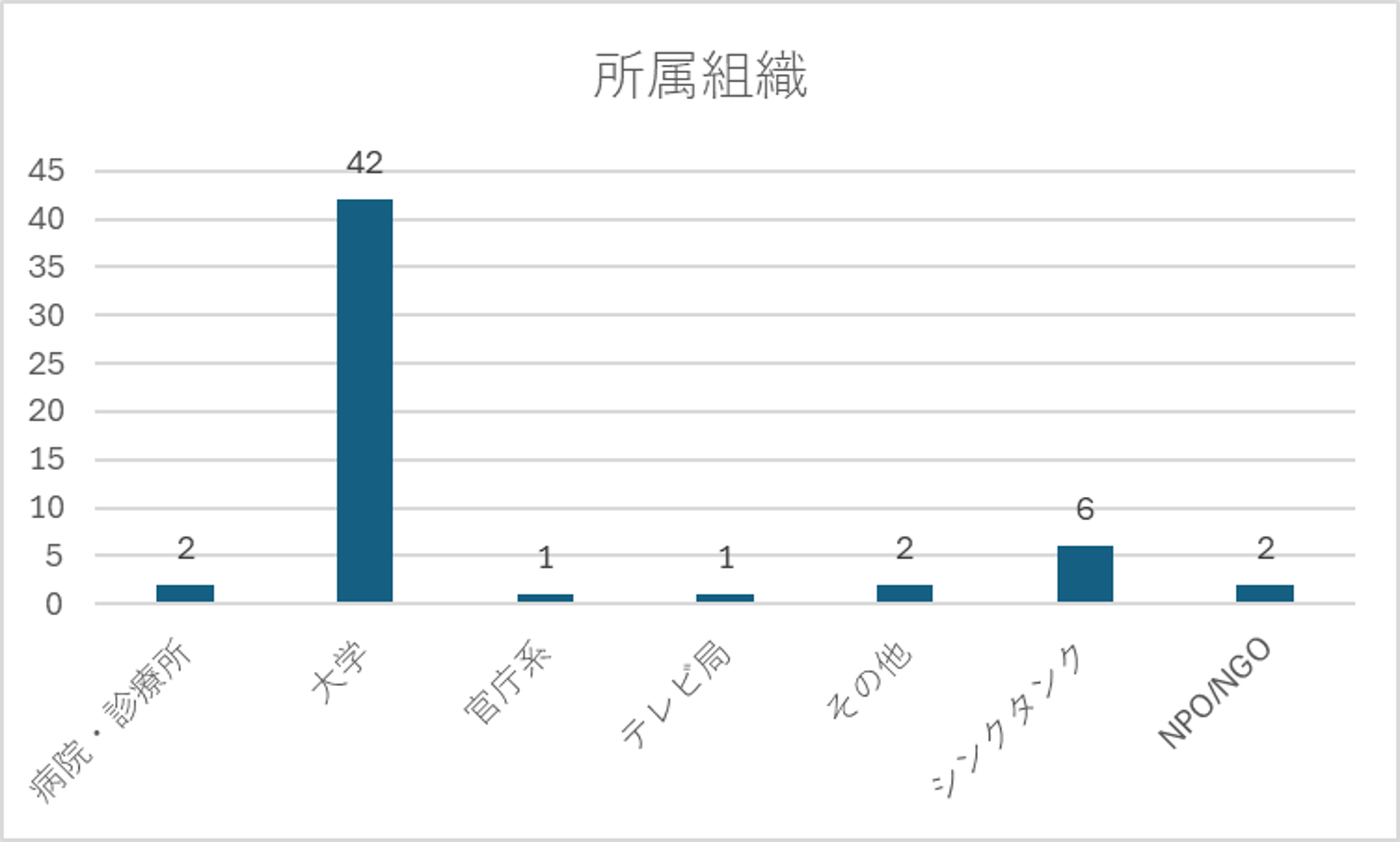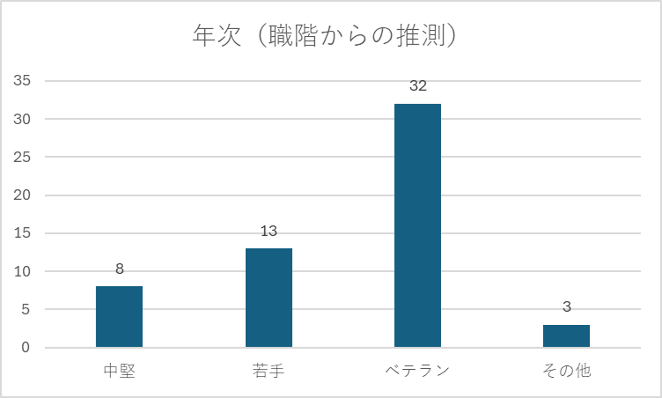 ・後述の所属組織が大学中心となっており、職階からの推測となりますが、若手(≒助教・専任講師レベル)・中堅(≒准教授レベル)とベテラン(≒教授レベル)が約2:3となりました。
