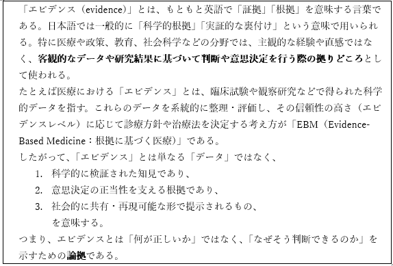 そもそも「エビデンス」とは何であるか。最近の常で、Chat GPT5に聞いてみたところ、以下のような回答を得た。