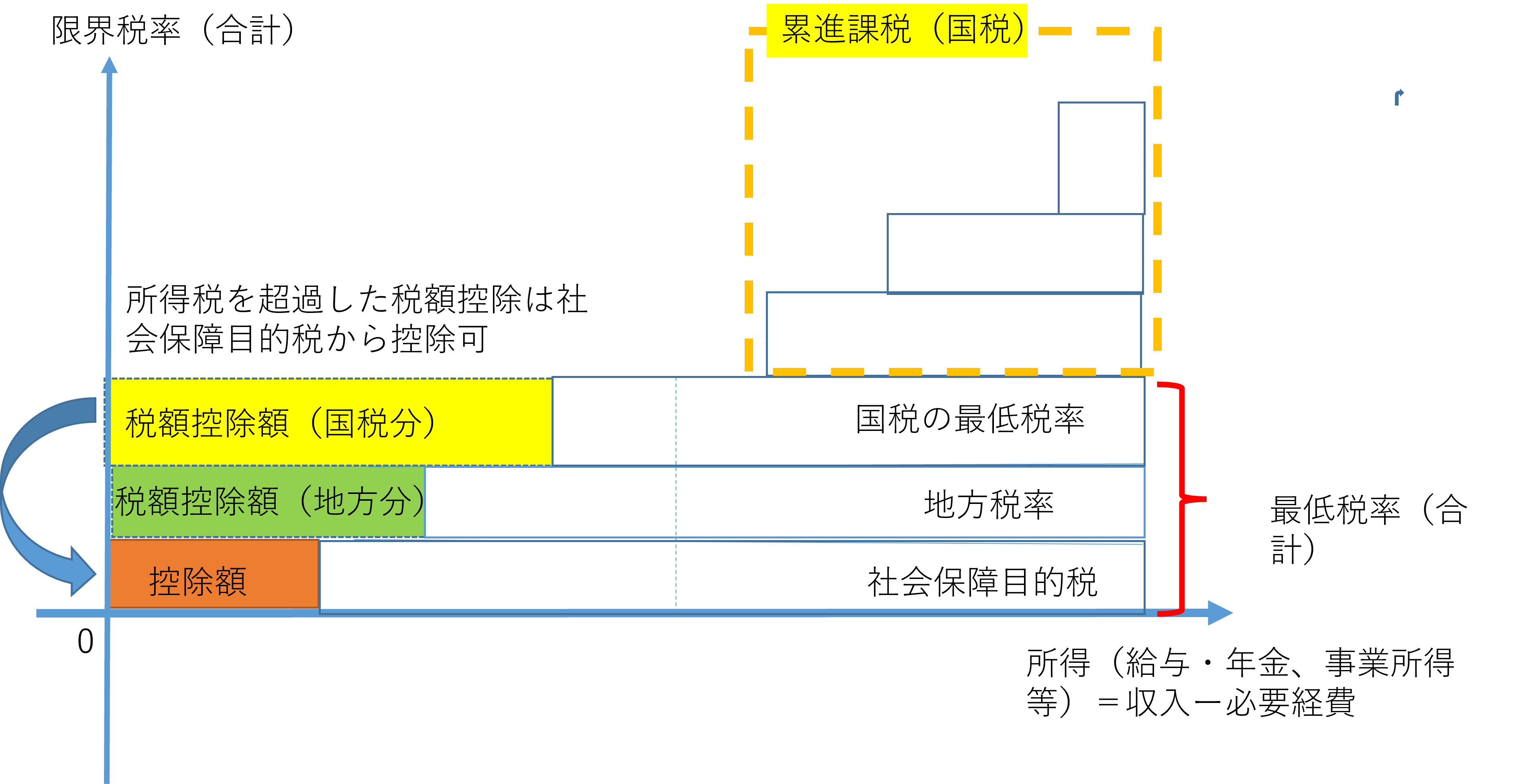 [9]所得税額は統一された課税所得(=収入マイナス必要経費)に税率表を適用、計算された金額から税額控除を差し引くことで導かれる。個人住民税、社会保障目的税の税額も同様に算出される。税額控除後の所得税額が負の場合、その分を社会保障目的税から控除する。