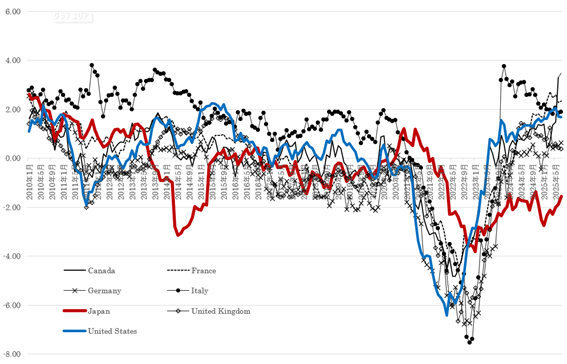 インフレ経済への転換との関係で、筆者が注目しているデータが、実質長期金利の推移だ。実質長期金利は「名目長期金利-インフレ率」を表すが、図表は、2010年1月から2025年7月までの名目長期金利やインフレ率に関するOECDデータから、主要7か国(日本、アメリカ、イギリス、ドイツ、フランス、カナダ)における実質長期金利を試算し、その推移を描いたものだ。