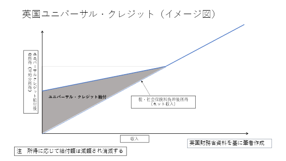 わが国でも、麻生政権の時に法律(所得税改正法附則)に検討が書かれ、民主党(当時)政権下でもマニフェストや法律(税制抜本改革法)で書かれ、双方で法律に検討が明記されたものの実現していない制度である。保守の立場から重視するのは、「ワークフェア」という考え方である。具体的にユニバーサル・クレジットの給付条件を見ると、申請者およびその配偶者は求職等にかかる以下の条件(conditionality)を満たさなければ停止されることとなっており、英国民からは厳しすぎるとの声も出ている。