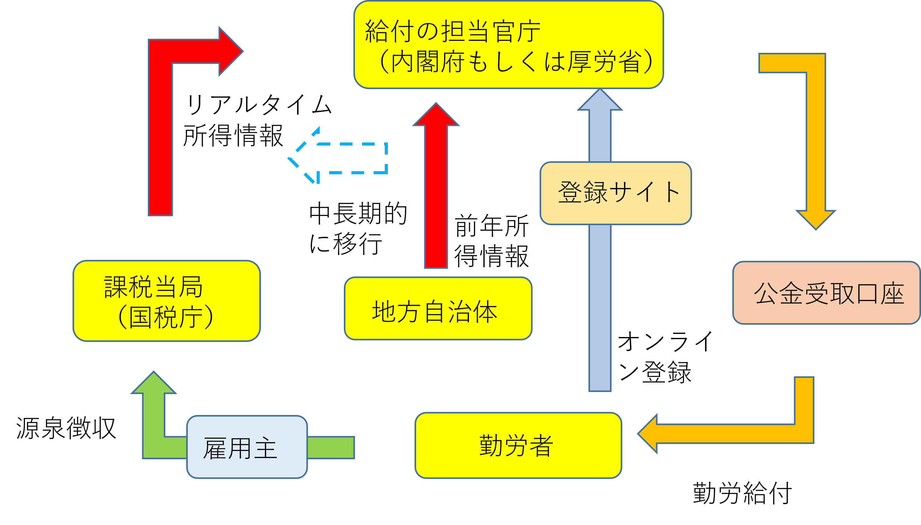 中長期的な改革として源泉徴収制度の適用範囲を拡大する。源泉徴収の範囲には給与の他、原稿料、講演料、デザイン料などの報酬が含まれる。しかし、WEBデザインへの対価は源泉徴収されるが、それが閲覧できるようにする製作活動には源泉徴収がないなど、多様化する経済活動の全てを網羅できているわけではない。被用者であれフリーランスであれ、その報酬に対して幅広く源泉徴収できるようにすることが望ましい。これは課税目的ではない。給付に向けて正しく所得情報を得るためである。雇用主は毎月の源泉徴収とともに、支払額=所得情報を課税当局(国税庁)に提出する体制を整備する。仮に支払いが少額で源泉徴収額がゼロであって、そのゼロと金額と一緒に所得情報を出さなければならない。これは英国の「リアルタイム情報システム」にあたる。自治体に依存する所得情報を国が直接、かつ(月ベースという意味で)リアルタイムに取得できるようにする。こうした所得情報は英国同様、国税庁から勤労給付の実施官庁へと提供される。[8]応じて支払い回数も年一回から毎月ベースに増やしていく。そのためにも、例えば今後5年以内に自治体の所得情報=前年所得からリアルタイム情報=前月所得に給付額の決定基準を転換できるようにする。デジタル技術の普及はこうした情報のオンライン上でのやり取りを可能にした。技術の進展を源泉徴収制度に反映させる。とはいえ、中小・零細企業には所得情報の提供や幅広い源泉徴収の事務は重い負担となる懸念がある。これらの業務を金融機関等が代行することも認めても良いだろう。例えば、雇用主Aが労働者Bに報酬を払うとき雇用主Aの口座を管理する金融機関Cが源泉徴収と合わせてBの所得情報を課税当局に提供する。[9]株式等証券取引から生じた金融所得の源泉徴収を担う「特定口座」を給与等の報酬にも援用、報酬は一旦、この特定口座を経由して個人の一般口座に振り込まれるイメージが近いかもしれない。