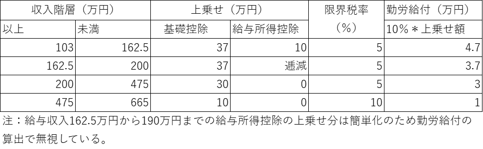 [7] 給与収入665万円から850万円までも5万円の上乗せ特例がある。これに10%を乗じた金額は5千円に過ぎず、些末なことから、ここでは勤労給付としない。