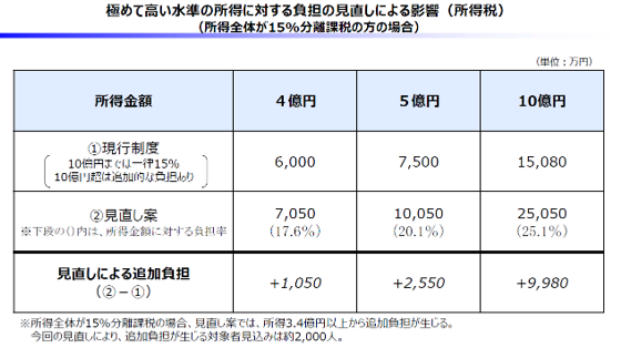 もう一つの財源確保は「極めて高い水準の所得に対する負担の見直し」だ。この税制は、金融所得課税の「一億円の壁」に対応するため税負担の公平の確保の見地から創設されたものだが、今回適用範囲を拡大しつつ税率を22.5%から30%に引き上げる。対象者は、これまでの200-300人から2千人程度に増えると見込まれており、増収見込みは5千億円程度だ。