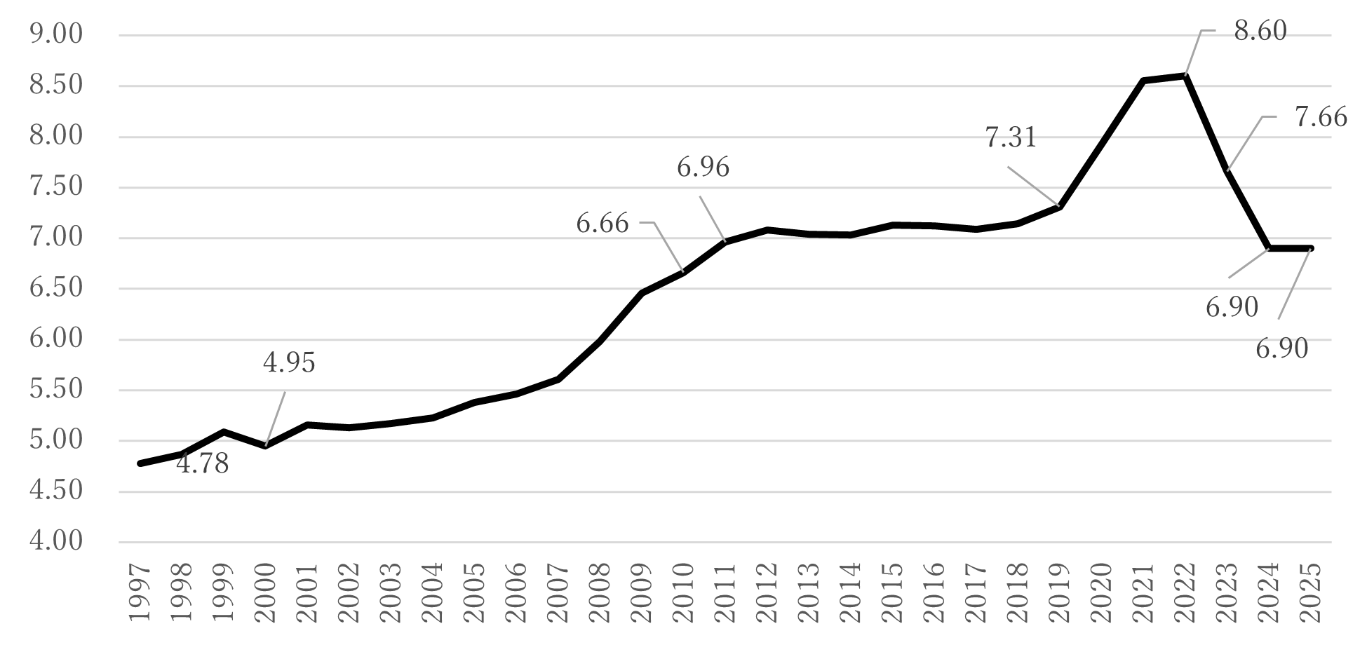 しかしながら、コロナの収束や、インフレ経済への転換に伴い、2023年度の医療給付費(対GDP)は7.66%まで低下するとともに、2024年度や2025年度も予算ベースの値だが、6.9%まで低下してきている。