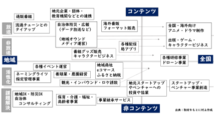 <左下>は、コンテンツ以外の地域事業を示している。明確に分けることはできないが、事業内容から、地域の活性化を担うものと課題の解決を担うものに分けた。活性化については、各種イベントの運営などに加えて、地域商社の運営やeコマース、ふるさと納税、インバウンド施策などの地域プロモーション事業が多い。課題解決については、自治体のDX事業や、放送局のブランド力や信頼を生かして、保育・福祉・介護・高齢者事業に乗り出す事業者も出てきている。また、最近目立っているのが、後継者不足で悩む地元企業の事業継承を請け負うマッチングの窓口や、地元のスタートアップやベンチャーへの投資を呼び込む場作りへの取り組みだ。後者については、放送局自身が投資をしたり協業したりするケースも増えている。
