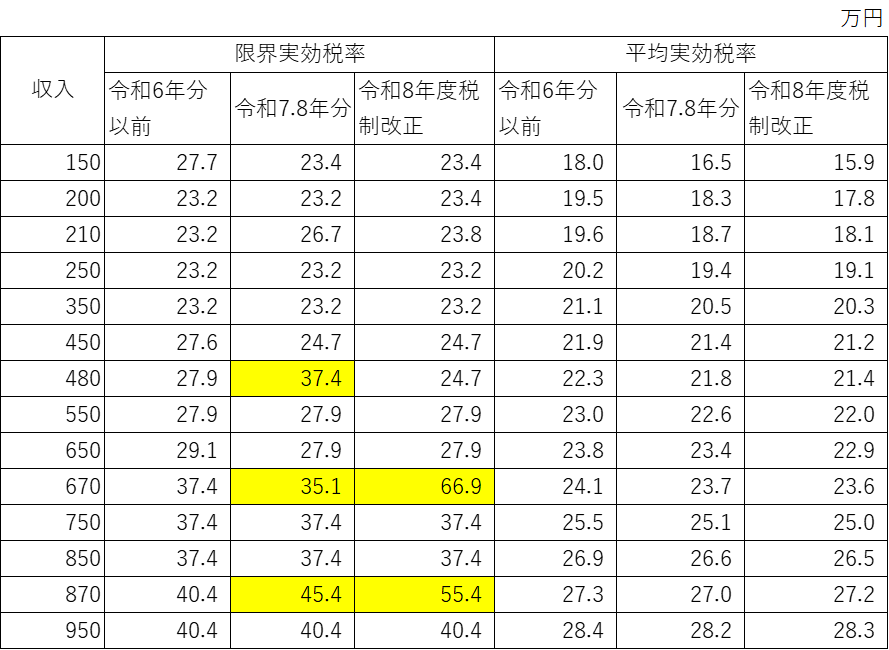 実効税率は単身世帯を想定する。よって所得控除は給与所得控除の他、基礎控除及び社会保険料控除に限られる。令和7年度税制改正、令和8年度税制改正では基礎控除が合計所得(=収入―給与所得控除)に所得制限が課された、結果、その控除が減額される閾値の収入で実効税率が急増している。例えば、令和8年度税制改正の場合、給与収入665万円を境に(上乗せ特例分を含む)基礎控除が104万円から67万円に減額される。限界実効税率は66.9%に跳ね上がる。年収870万円でも限界実効税率が上昇しているが、これも基礎控除が67万円から52万円へ引き下げられることに拠る。[3]社会保険料が適用される「106万円の壁」(従業員51人以上の事業所で労働時間が週20時間以上の場合)では手取り収入を織り込んでいる。実効税率が100%を超えるケースに当たる。英国のユニバーサルクレジットであれ、米国の「稼得所得税額控除」であれ、こうした「壁」を避けるべく、(閾値を超えた)収入に対して給付を一定率で逓減させる措置を設けている。