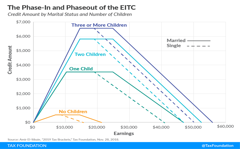 英米など多くの国での主たる導入目的を見ると、減税・給付により勤労インセンティブを高めることにある。米国の勤労税額控除(EITC)を見ると、図表のように、低所得の段階では、所得に応じて減税・給付が増える仕組みになっており、勤労意欲を掻き立てるよう設計されている。