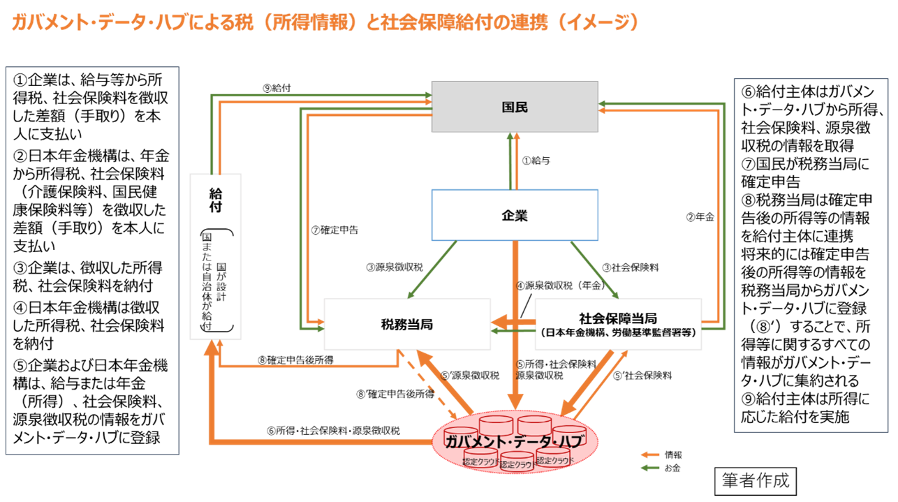 筆者は「ガバメント・データ・ハブ(仮称)」というアイデアを提言している。これは国、地方の各行政機関、日本年金機構、民間企業等がそれぞれデータを管理しつつ、共通で利用できる仕組みである。企業は従業員の所得情報(収入や源泉徴収額)を毎月会計ソフトで管理しており、その情報を国が認定する民間のクラウドにデータ保管し、税務当局、社会保険当局や給付官庁がアクセスし、この情報を給付につなげる。