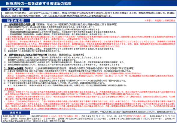 前回紹介したように、今般の法改正の柱は、(1)地域医療構想(地域医療提供体制)見直し、(2)医師偏在是正の総合対策、(3)医療DXの推進の3点である[2]。