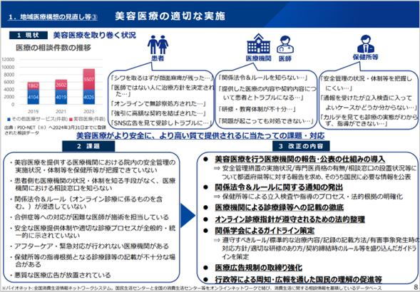 近年問題となっている無資格者や経験が浅いもの(いわゆる「直美」)による美容外科手術やトラブル多発を背景に、美容医療を提供する医療機関に対する定期報告義務が新設された。具体的には、美容外科等を標榜するクリニックは施術件数や事故防止策等について所管行政に報告することが求められるようになる。違反時の行政処分等も視野に入れた措置であり、適正な美容医療の提供と患者保護を図る狙いである(この規定は公布後2年以内を目途に施行予定)。