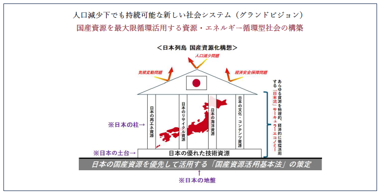 - あらゆる国産資源を積極活用することで、資源の海外依存による国富の流出を防ぎ、人口減少下でも実質賃金の向上に寄与するとともに、資源の供給途絶という経済安全保障上のリスクに対応し、さらには気候変動問題へも対処する新しい社会システム(グランドビジョン)を構築する。