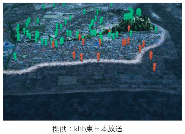 この作品の背景には、「あの時プロジェクト」と呼ばれる調査がある。公益社団法人3.11メモリアルネットワークなどが中心となり、石巻市南浜・門脇地区の住民100人以上から震災当日の行動を聞き取り、どこにいて、どこへ向かい、なぜその判断をしたのかを詳細に記録したものである。khbの番組は、この調査結果をもとに当日の避難行動をCGで再現し、津波避難の実態を可視化した。証言として語られる出来事を、空間の中で起きた人々の行動として再構成した点に、この作品の特徴がある。これは、映像メディアならではの視点である。