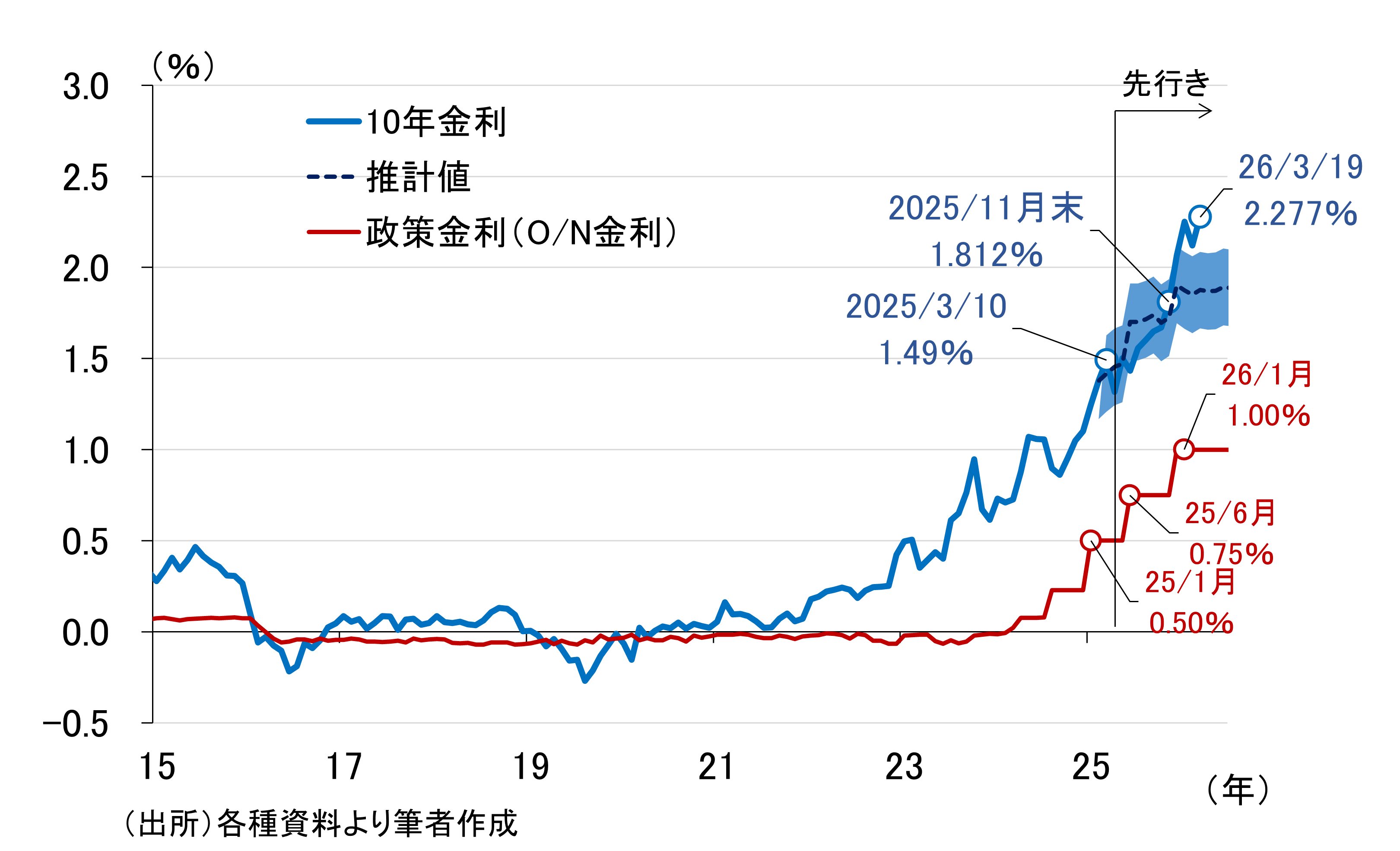 昨年3月17日に開催した対応プランの説明会で、当面のわが国の10年金利について、標準誤差まで含めて考えれば2026年初めに2%台到達もあり得ると説明しました。下図はそのときに示した見通しのグラフに(見通しは点線)、その後の10年金利の推移を加えたものですが(10年金利の実績値は青い実線)、パスに多少のズレはあるものの、秋くらいまでは概ねオントラックで推移していたことが分かります。