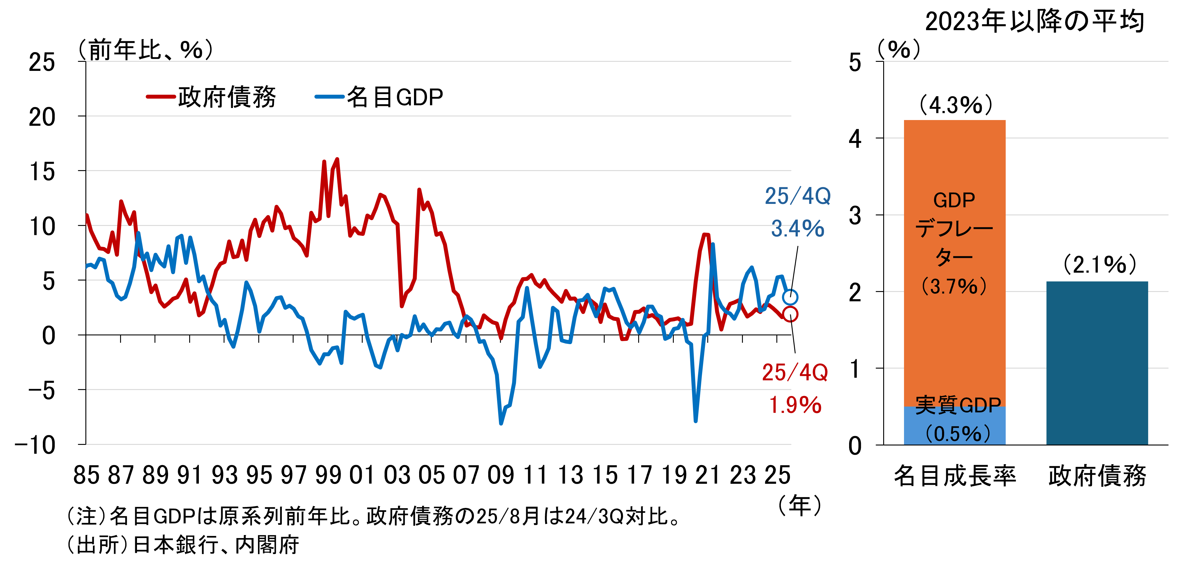 「責任ある積極財政」の要諦は、政府債務残高の伸びを名目成長率の範囲内に抑制しながら財政を拡大することですが、ここ3年程度の政府債務残高の伸びと名目成長率を確認すると(下図参照)、前者が2.1%、後者が4.3%であり、こうした構図が維持されれば、責任ある積極財政の「責任ある」は維持できそうに思えます。