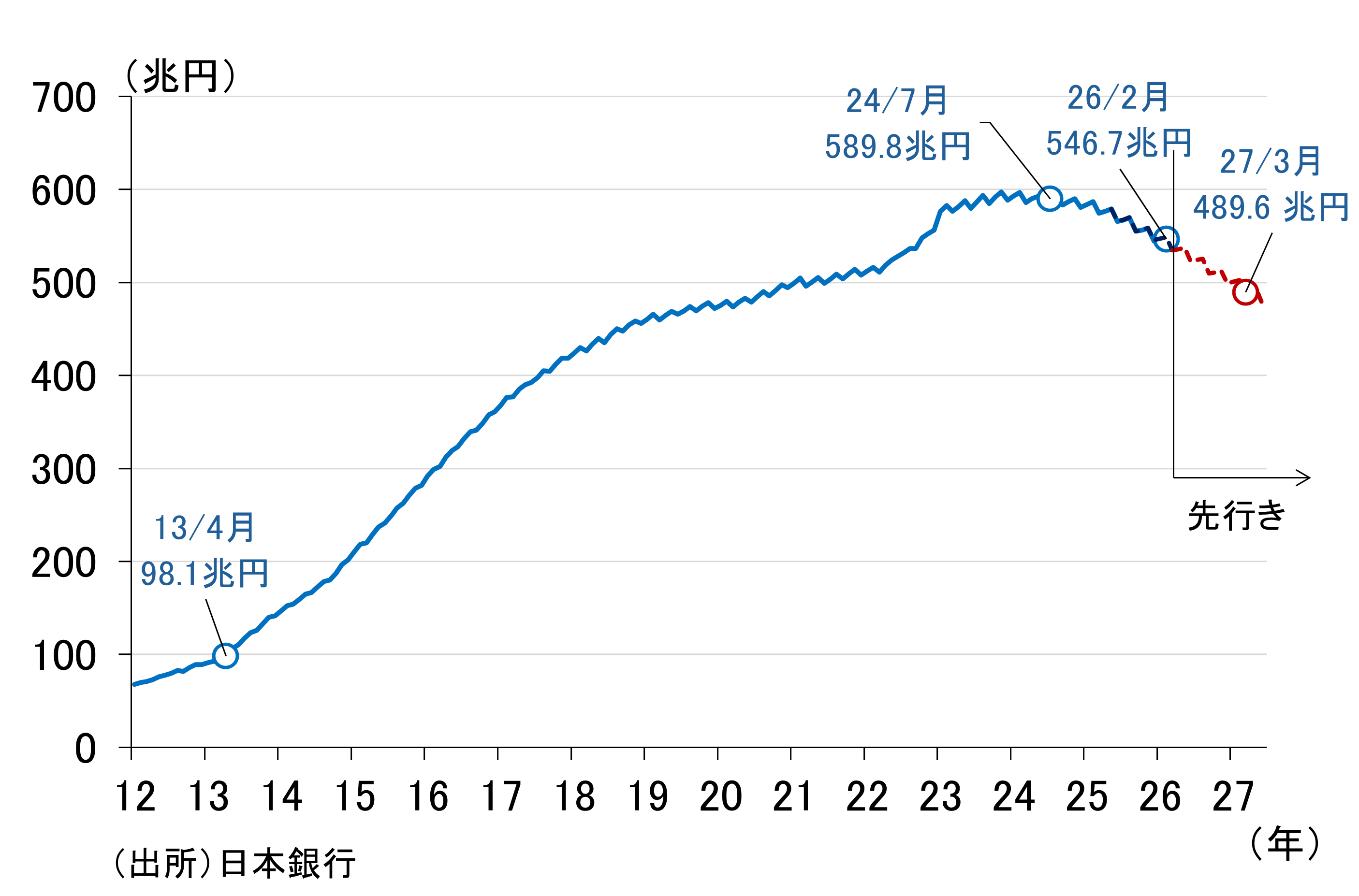 日本銀行は昨年6月、長期国債買入れの減額について、毎四半期4,000億円ずつ減額していた月間の長期国債買入れ額を、2026年4〜6月から2,000億円に縮小し、2027年1〜3月に月約2兆円程度とする計画を発表しました。これにより、日銀の長期国債保有残高は着実に減少しており、2026年の終わりにも500兆円を下回る見通しです(日銀決算の償却原価法による計上額、下図参照)。ちなみに、時価では2025年末時点ですでに503兆円となっています。
